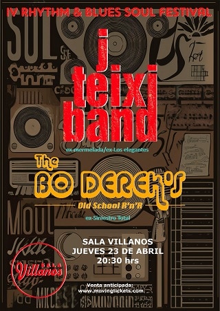 J. Teixi Band, la mejor banda de Rhythm&Blues, con letras en castellano, encabezada por Javier Teixidor, líder del histórico grupo Mermelada (Madrid 1977), presentan trabajo. Acompañado de ex-miembros de Los Elegantes, la banda Mod R&B de Madrid formada en 1979, convierten sus directos en auténticas fiestas, aportando calidad y potencia con un sonido abrrumafdor y compacto; la banda aborda con maestría desde el soul hasta el blues. Rhythm&Blues puro sin concesiones. Uno de los mejorres dirrectos del panorama actual, explosivos.