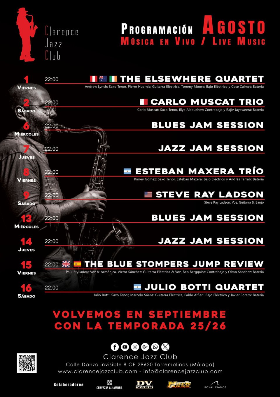 Concierto de Jazz. Concierto en Clarence Jazz Club, Torremolinos (Málaga) el Viernes 27 de Junio de 2025. Es una actuación de estilo Jazz/Swing.